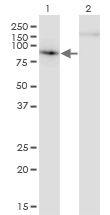 Western Blot analysis of EP400 expression in transfected 293T cell line by EP400 Monoclonal Antibody [2A7].Lane 1: EP400 transfected lysate (105.7 KDa).Lane 2: Non-transfected lysate.