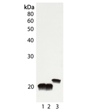 Fig. 1. Western blot analysis of Cu/Zn SOD Polyclonal Antibody: Lane 1: Rat liver tissue lysate, Lane 2: Mouse liver tissue lysate, Lane 3: HeLa cell lysate.