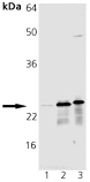 Fig. 1. Western blot analysis of Mn SOD Polyclonal Antibody: Lane 1: HeLa Cell Lysate, Lane 2: Rat Brain Tissue Extract, Lane 3: Mouse Brain Tissue Extract.