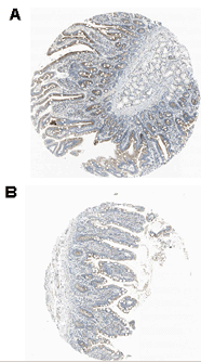 Fig. 1. Immunohistochemical staining of endogenous human RANKL in different human tissues (paraffin sections) using RANKL Monoclonal Antibody [RANKY1] (A: Duodenum; B: Small intestine).