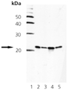 Fig. 1. Western blot analysis of Smac/Diablo. Lane 1: MW marker, Lane 2: 293, Lane 3: HeLa, Lane 4: Jurkat, Lane 5: Vero.